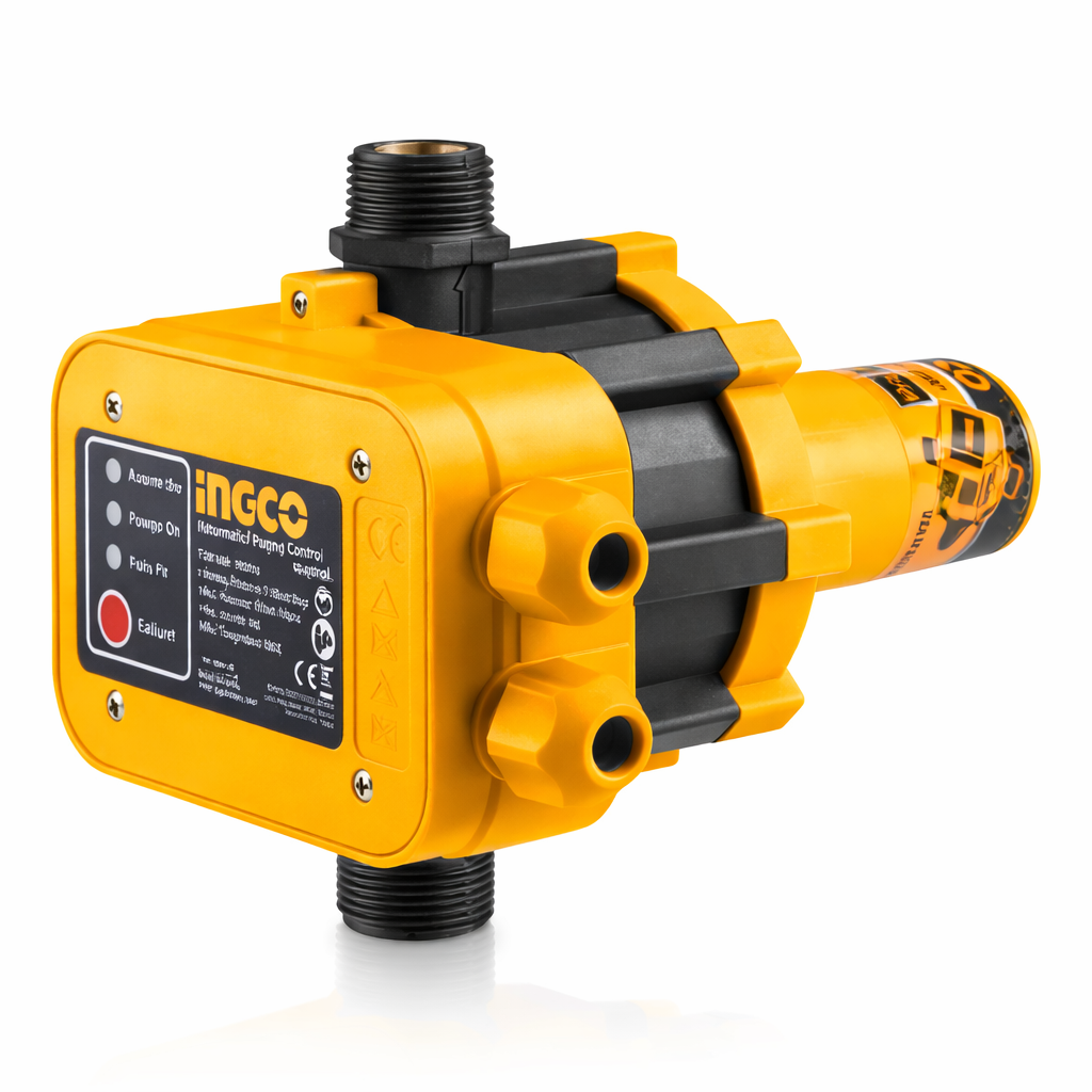 The INGCO Electronic Automatic Water Pump Pressure Controller is designed to automate pump operation in household, garden, courtyard, and greenhouse water systems. It starts the pump when water demand is detected and stops it when flow ceases, helping reduce unnecessary pump cycling and improving convenience in everyday water supply setups.
